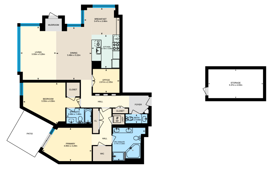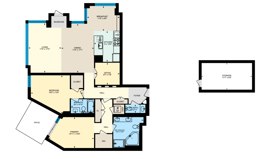 The generous Primary Bedroom not only includes a luxurious and open white marble clad 5 piece ensuite, but also a walk in closet, separate double closet and a walk out to a private patio area. The second bedroom is also very generous with a large closet and its own 4 pc bath.