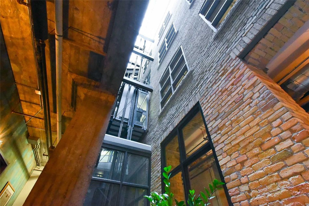 UNDERGROUND PARKINGLiberty Lofts in downtown Toronto is a four-storey brick structure that in its early days was the home of the Gillette Razor factory and now a boutique loft complex. In 2001 it was converted into hard lofts. On entering the complex there is an inspiring sky lit atrium that was preserved from the original factory’s courtyard. The open front window elevator overlooks the open courtyard space that stretches up form the center of the atrium.