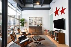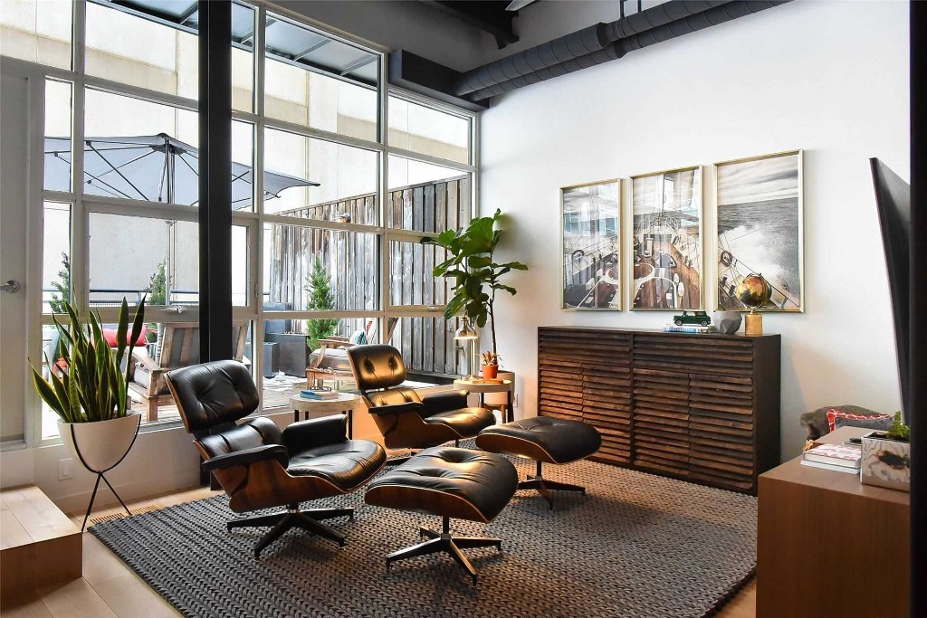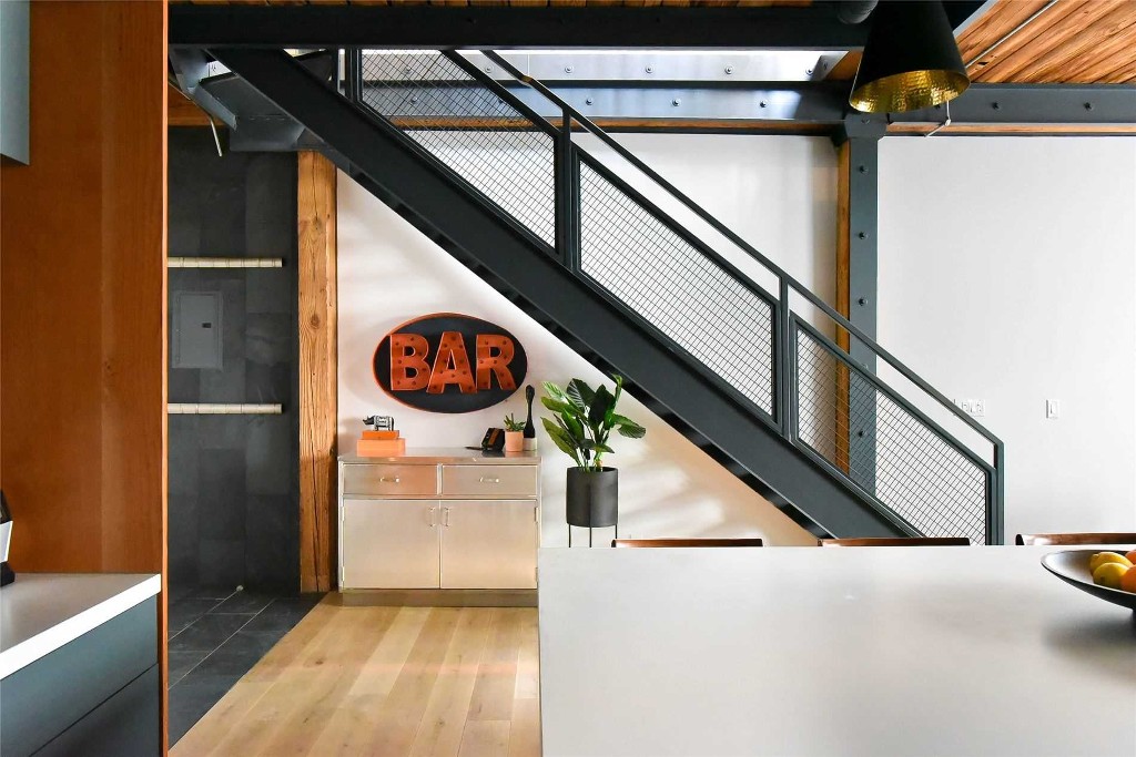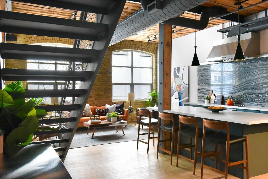 This Toronto loft features wood beam, exposed brick, grey brick or concrete interiors. Liberty Lofts offers one-bedroom and 2 level – 2 bedrooms with ceiling heights that soar 11-13ft high, roof terraces, concrete columns, brick posts and oversized warehouse style windows.
